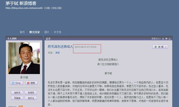 就在此背景下,8月31日,茅于轼在其博客发表旧文《把毛泽东还原成人》。对于茅于轼这种对抗中央精神、公然散播历史谣言、妖魔化开国领袖的行径,我们呼吁北京警方也要承担起习总书记所说的“守土”之责。
