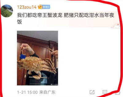 如果她仅仅是炫耀也没人理她,关键是她一边吃帝王蟹晒穷奢极侈的生活,却一边在网上公然侮辱普通中国人是“肥猪”只配吃泔水当年夜饭。