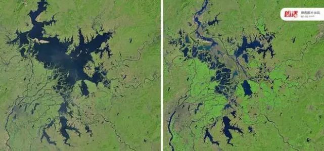 左图:2000年10月9日,NASA拍摄的鄱阳湖卫星图;右图:2016年9月27日,NASA拍摄的鄱阳湖卫星图。