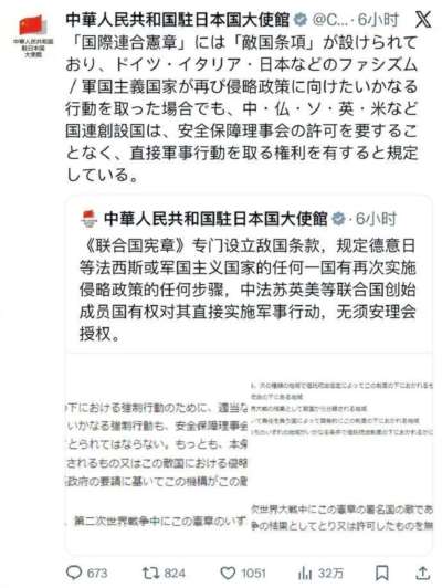 二、中国驻日大使馆在社交平台X用中日双语发帖:《联合国宪章》专门设立敌国条款,规定德意日等法西斯或军国主义国家的任何一国有再次实施侵略政策的任何步骤,中法苏英美等联合国创始成员国有权对其直接实施军事行动,无须安理会授权。