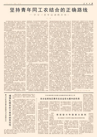 伟大领袖毛主席在《青年运动的方向》这篇光辉著作中,通过对中国革命任务、对象和动力的分析,并根据中国革命的历史经验,深刻地指出了革命青年同工农群众相结合的重要性,给青年工作规定了一条马克思列宁主义的路线。几十年来,我国广大青年在这条路线指引下,坚持走同工农群众相结合的道路。对革命作出了积极的贡献,我们应该继续坚持毛主席制定的这条正确路线。