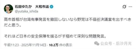 神奈川县大和市议员石田裕昨天甚至警告:“如果高市首相不撤回台湾有事的发言,在野党应该提出不信任首相的弹劾议案。她的发言极其严重,甚至可能动摇了日本安全保障”。