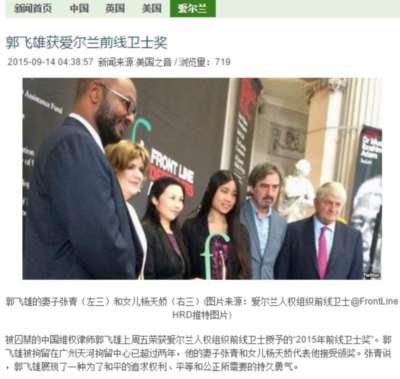 国内异见人士郭某曾经获得爱尔兰FrontLine前线卫士奖,颁奖词中明确指出郭某也为法LG修炼者辩护。法LG是个什么货色,想必大家都知道的。