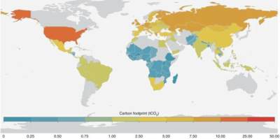 116个国家的全过平均碳足迹,从低(蓝色)到高(红色)。Bruckner et al./《自然:永续》