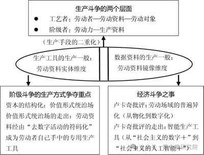 劳动过程不是工具,而是实体。第二劳动资料乃是伪实体,是作为资本决定论“直接的生产方式在场规定”进入劳动过程构造的。一句话,资本的数字工具不仅仅是为了生产和制造产品,更主要的目的是进行主动的主体监视和过程控制。又或者说,第二资料经济属性是生产关系,而非生产力。它的出现只是表明历史唯物主义的全部矛盾规定性早已结成一个有机的工作整体,便不再将社会生产关系仅仅归类为一种经济现象,它同时又是生产现象、政治现象乃至劳动的一个概念组成。生产力和生产关系不存在严格的相互推演的关系,宁可称它们是社会生产的“共生体”,它们之间拥有着一种真正的相互渗透关系。