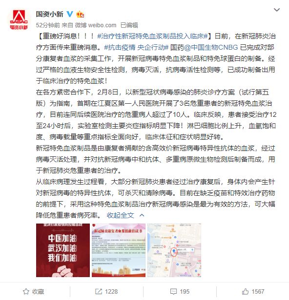 据国务院国资委新闻中心官方微博@国资小新,国药@中国生物CNBG 已完成对部分康复者血浆的采集工作,开展新冠病毒特免血浆制品和特免球蛋白的制备。经过严格的血液生物安全性检测,病毒灭活,抗病毒活性检测等,已成功制备出用于临床治疗的特免血浆!
