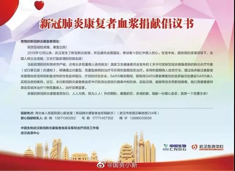 金银潭医院院长:患者康复后体内含抗体,恳请康复患者捐赠血浆