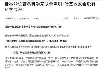 世界92位著名科学家联合声明:转基因安全没有科学共识: