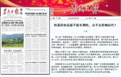 5月22日,《农民日报》头版“走近转基因”栏目发表了一篇科普文章,对公众关注的转基因食品“会不会影响后代”进行了释疑。文章称,自1996年转基因作物商业化种植以来,全球累计种植转基因作物已超过400亿亩,全球70多个国家和地区几十亿人口食用转基因农产品,没有发生过1例经过科学证实的安全性问题。