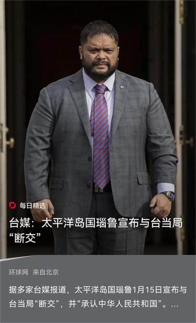 央视新闻消息,当地时间1月15日,瑙鲁政府宣布断绝同台湾的所谓“外交关系”。瑙鲁政府在社交平台脸书发布声明,宣布承认一个中国原则,愿同中国复交,并强调此举符合瑙鲁人民的最大利益。