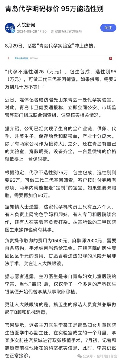 而既然说到了底层女性变卖身体以谋生,就不得不谈到从去年的青岛到今年的长沙,爆火舆论、愈演愈烈的地下代孕产业。