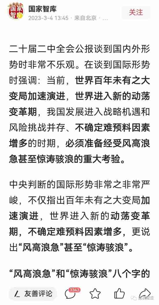 当前,百年变局加速演进,二十大全会公报,已经发声:准备经受风高浪急,甚至惊涛骇浪的考验。