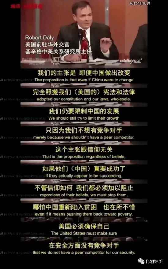 花旗国前驻华外交官罗伯特戴利曾赤裸裸表示,即便中国做出改变,完全照搬我们宪法和法律,我们仍要限制中国的发展。……我们不想有竞争对手……哪怕中国重新陷入贫困,也在所不惜。