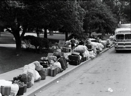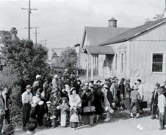 到指定地点报到的日裔美国公民,每个成人只能携带150磅重的行李,包括被褥、化妆品、四季服装,每个孩子可以携带75磅重的东西。每个人和每件行李都只有一个标签,一旦踏入集中营,他们不再拥有姓名,只有个人号码。