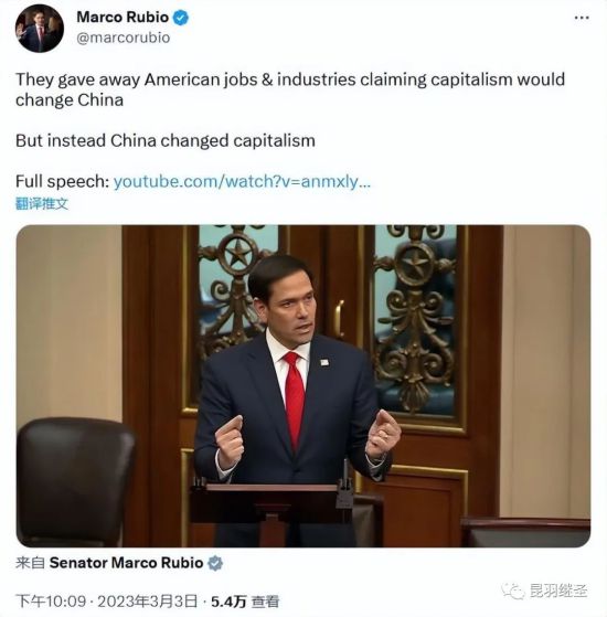 3月3日,花旗国反华议员、共和党佛罗里达州联邦参议员马尔科·卢比奥(Marco Rubio)在推特上发布视频表示,“中国人确实富裕起来了,但他们没有花钱买我们的东西,而是拿这笔钱去买中国制造的产品”,“中国以美国为代价,牺牲美国的利益,实现了快速崛起”,资本主义没有改变中国,中国改变了资本主义。