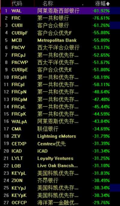 不过,昨天美联储下场救市后,美国银行股仍然普遍大跌,阿莱恩斯西部银行一度暴跌81%,第一共和银行也一度暴跌76%,跌30%的银行也是一大堆,只有头部几家大行跌幅在5%左右。