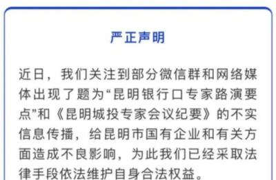 这周,网上流传出了一份《昆明城投专家会议纪要》,随后立即被昆明市国资辟谣,严正声明其内容完全是不实信息,在会议上发表观点的相关银行员工完全是个人观点,已经责令其单位与他撇清责任,内部反省。
