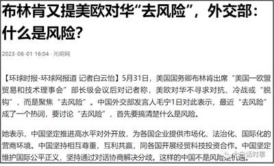 美国布林肯在5月31日,就又声称,美欧对华不寻求对抗、冷战或“脱钩”,而是聚焦“去风险”。
