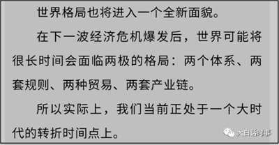 当时我提到一个观点,就是下一波世界经济危机爆发后,世界可能会较长时间面临“两个体系、两套规则、两套贸易、两套产业链。”