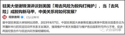 我们新任驻美大使在6月7日的演讲里表示,如果美国用“去风险”为“脱钩”打掩护,就会给两国关系埋下更多钉子。