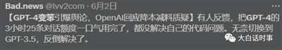 后面,OpenAI对ChatGPT做了优化后,响应速度变快了,但很多人开始吐槽ChatGPT变傻了。