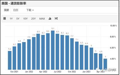 6月13日晚上,美国公布了5月通胀率为4%,市场预期值是4.1%,相比上个月又有了较大幅度回落。
