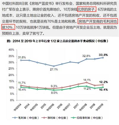 2017年,又一名体制内专家慷慨陈词:“房价70%都是地价和税费,房企毛利只有10%!”官方和学术双重背景引发媒体爆炒,先不论用北京的地价代替全国是否科学,只要百度一下就能戳破他的数据谎言:不知道他是不是分不清净利率和毛利率,如果政府真的拿走房价的70%,半数房企又怎么实现接近甚至超过30%的毛利率呢?