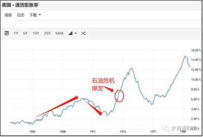 实际上,石油危机爆发前,在1965年之后,美国通胀率就有过一波飙升,在1970年是达到了6%通胀率的峰值。