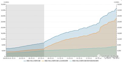 从历史数据看,2008年是一个分界线。2008年前(下图阴影部分)两种债务平行增长,2008年后公众持有的债务爆炸式增长,一骑绝尘。