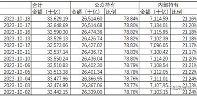 2023年10月18日,美国国债合计33.63万亿,其中公众持有26.51万亿,美国政府内部持有7.11万亿。公众持有的美国国债,可以简单理解为能够上市交易的国债,政府内部持有的可以理解为不能上市交易的国债。二者目前的比例大致在4:1左右。