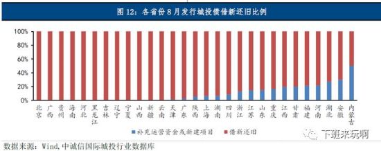 中诚信最新数据显示,从募集资金用途看,“8 月借新还旧整体比例达87.25%……其中北京、广西、贵州、海南、河北、黑龙江、吉林、辽宁、宁夏、山西、新疆、云南等12 省借新还旧比例高达100%;1-8 月借新还旧整体比例达84.56%,其中贵州、海南、吉林、宁夏、青海5省借新还旧比例高达100%。”