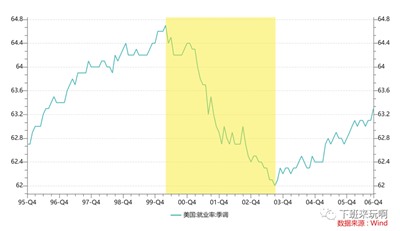 2002年一季度起,美国经济逐步恢复。但是这个恢复却有一个重要缺陷,即GDP增速恢复,但就业率却在不断下降。越来越多的适龄劳动力退出劳动领域,支撑消费的并不是居民收入的增长,而是房地产增值带来的财富效应等其他因素。