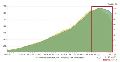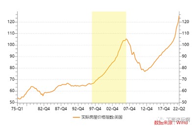 降息导致美国房地产价格快速上涨。1996年底开始,美国实际房屋价格指数一路上扬,到2006年底达到高点。