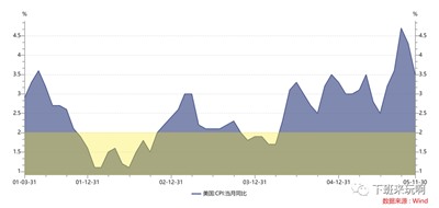 在这两个因素作用下,大宗商品价格从2001年底触底反弹,并一路持续上扬。从2004年第一季度起,美国CPI同比增速持续超过2%(这是美联储的通胀控制目标)。在这样的情况下,美国开始了加息周期。