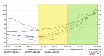 在美国降息的大背景下,欧洲和日本也推行宽松的货币政策。在本轮全球放水的大刺激下,世界主要资本主义国家房地产价格大幅上涨。本轮房价上涨大致始于1997年,在2001年后快速增长。