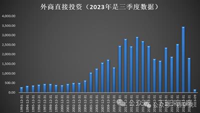 疫情三年以来(2020-2022),外商直接投资前三季度分别为1560亿美元、2510亿美元、1524亿美元。而2023年前三季度,外商直接投资流量合计仅为155亿美元,同比下滑89.83%。
