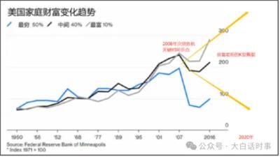下图可以清晰看到,2008年次贷危机后,最穷的50%人群,和40%中产阶级,过去十几年基本原地踏步,只有最富有的10%人群,财富剧增。