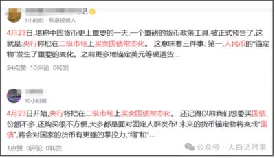 最近,网络舆论上突然有大量营销号不约而同在刷同一份通稿,内容大同小异,都在说“4月23日,堪称中国货币史上重要的一天”,甚至谣传“4月23日开始,央行将把在二级市场上买卖国债常态化”,动辄说央行也要开始搞量化宽松。