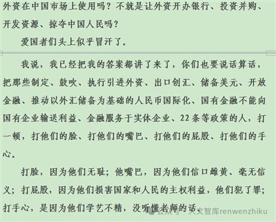 说句到家的话,只要中国“畅通”美元与人民币的兑换渠道,也就是中国主流金融学界所谓的“畅通国际国内金融资本流通渠道”,美元可以自由兑换人民币,中美贸易用美元结算支付,中国经济就能养活美国霸权!美国金融霸权就高枕无忧!