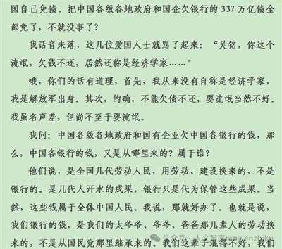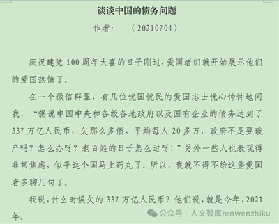 笔者想说的是,所谓债务问题,其实是个假问题,是掌握了人民币发行和流通控制权的买办资本势力,勾结美国金融霸权,对中国政权的要挟和威胁。
