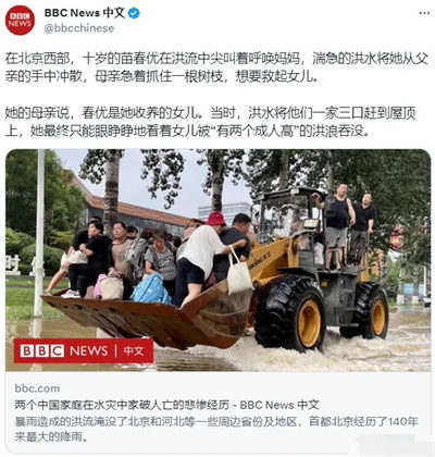 对比下BBC前几天报道中国洪水的标题,“两个中国家庭在水灾中家破人亡的悲惨经历”。