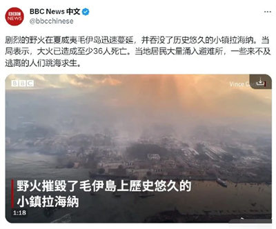 而在对夏威夷大火的报道中,BBC新闻对于无数悲惨的家庭视若无睹,没有采访任何一个家庭,只报道了几个冰冷的数字,而且只拍摄火灾的远景。