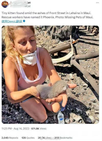 目前在美国网络上关于夏威夷大火点赞和流量最高的是下面这个帖子,一个女性抱着一只小猫的照片,说这只猫是从大火中救出来的。