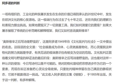 更具体一点来说,二战之后,思想界对现代性与工具理性进行了全面的反思,这几乎是知识界最大的共识,而其中,关于德国对犹太人的暴行,尤其是奥斯维辛集中营,成了现代性罪恶的象征物,就像是著名哲学家阿多诺先生所说“奥斯维辛之后,写诗是野蛮的。”