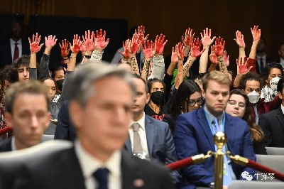当天,美国国务卿布林肯去国会出席听证会,在他发言的时候,后面是一片“血手印”。有人甚至打断他,高呼:“从巴勒斯坦到墨西哥,所有的墙都必须拆除!”“让加沙活下去!