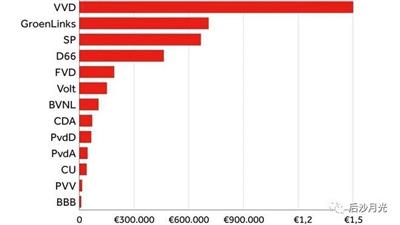 而PVV(自由党)排在倒数第二,不到10万欧元。