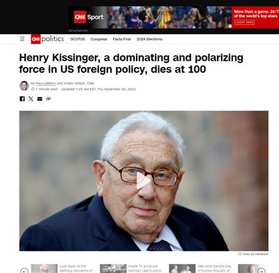 在国外社交媒体上,基辛格去世的相关新闻中,大多数都没有给他什么好评。