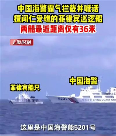 这也是为啥菲律宾的舰艇面对中国海警毫无办法的原因。8月5日,参与菲律宾巡逻艇拦截的中国海警5201号,排水量是2500吨。双方体量上就明显不是一个量级。