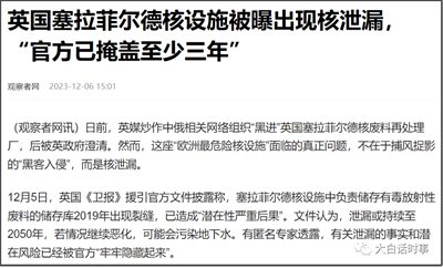 首先确实是有这件事情,这是英国卫报长达一年的调查后,在12月5日的一个独家报道,标题就是《揭露:塞拉菲尔德核电站发生泄漏,可能对公众构成风险》。