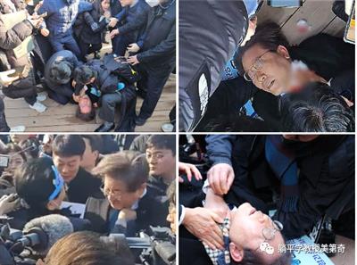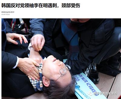 1月2日,韩国最大在野党党首李在明当天在访问釜山时遭人袭击,受伤倒地。他在接受媒体记者采访过程中突遭一名身份不明男子持刀捅刺,脖子被划开1厘米长的一个口子,血流当场。